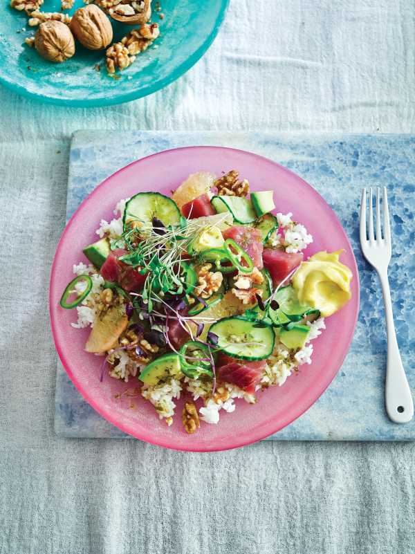 5. Den Reis auf zwei Teller geben. Mit Thunfisch, Gurkenscheiben, Avocadostücken, kalifornischen Walnüssen, grünem Chili, Grapefruitstücken und den Mikrokräutern bedecken. Das Limettendressing darüber geben und mit einem Klecks der Wasabi-Mayonnaise garnieren.