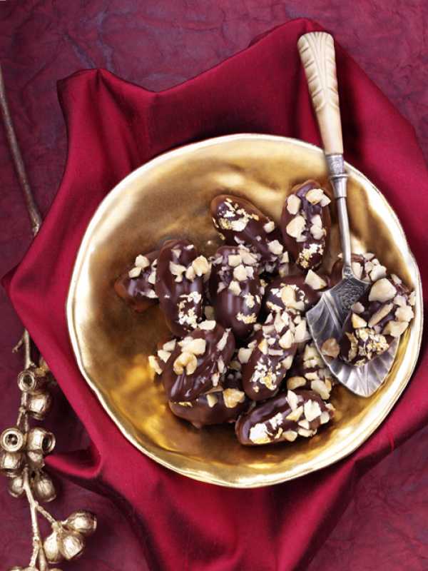 Tipp: Besonders edel sehen die Walnuss-Dattel-Pralinen aus, wenn sie mit einem Hauch Blattgoldpuder oder -flocken bestäubt werden.